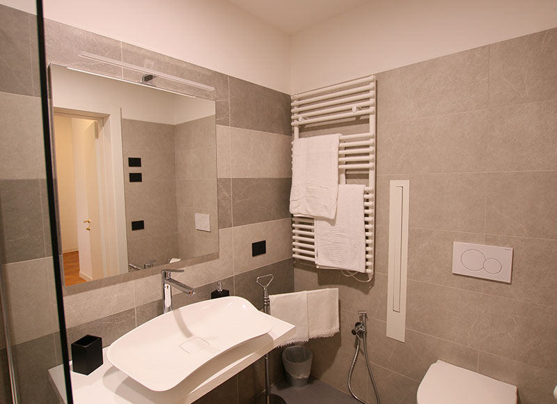 Il bagno, dal design contemporaneo, è dotato di finiture ricercate e di un comodo box doccia, offrendo uno spazio funzionale dedicato al benessere quotidiano. La camera Mirella è ideale per chi desidera soggiornare in un ambiente tranquillo, dove il fascino della dimora storica incontra una visione attuale dell’ospitalità.
